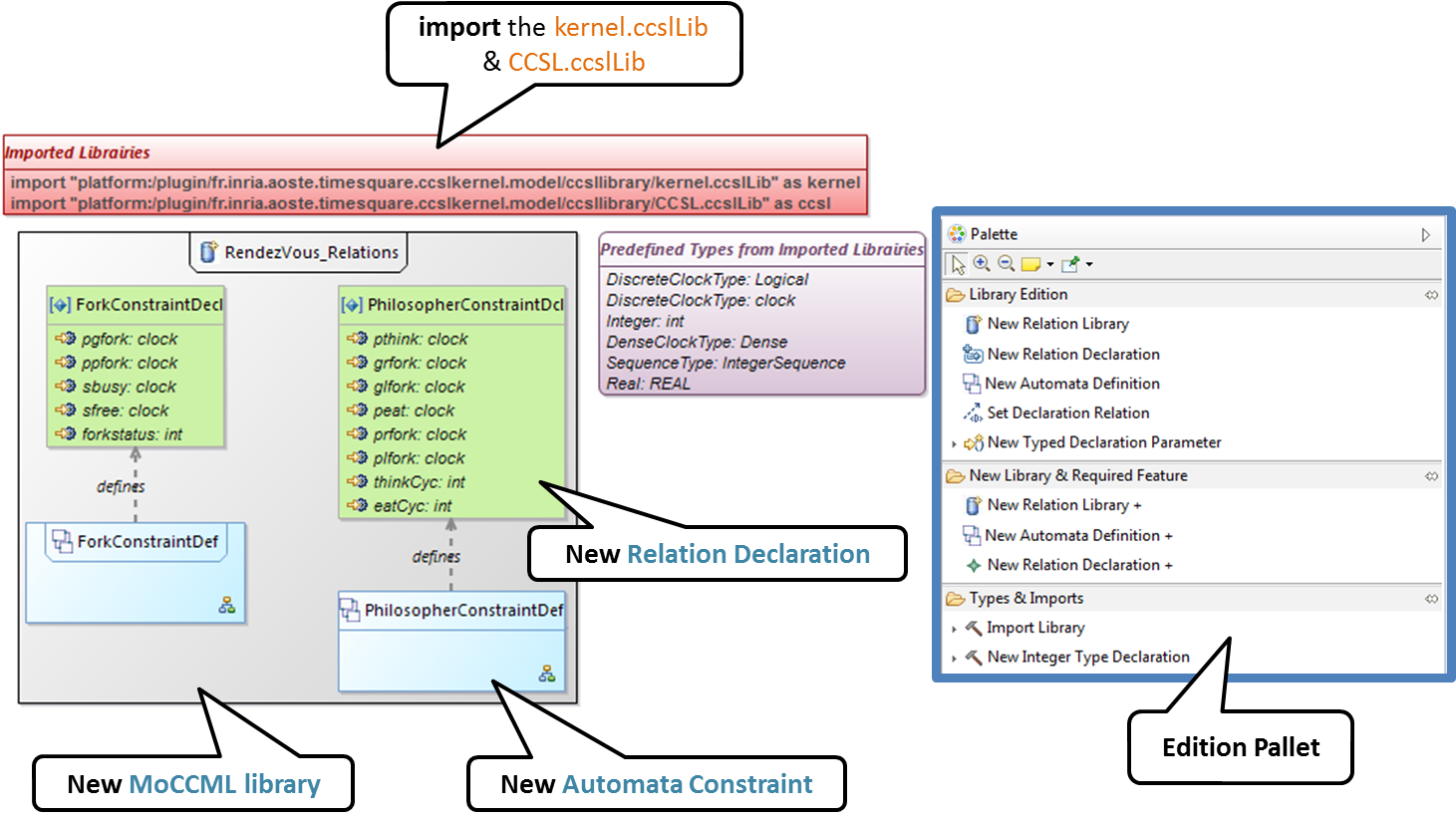 In a MoCC library, we define constraints and their declarations. The declarations identify events and parameters to be considered in the implementation of the constraint. In the editor, the declaration is made using the two above mentioned pallets, and using the elements in the pallets i.e.: New Relationship Declaration and New Relationship Declaration +. The two differ in that the latter creates a Relation Declaration with a default formal parameter declaration. In the Figure Figure 3, “Screenshot of the First graphical level of Edition in MoCCML.”, we create two relation declarations (ForkConstraintDecl and PhilosopherConstraintDecl). Listing ??? also shows the equivalent textual code generated for the PhilosopherConstraintDecl.